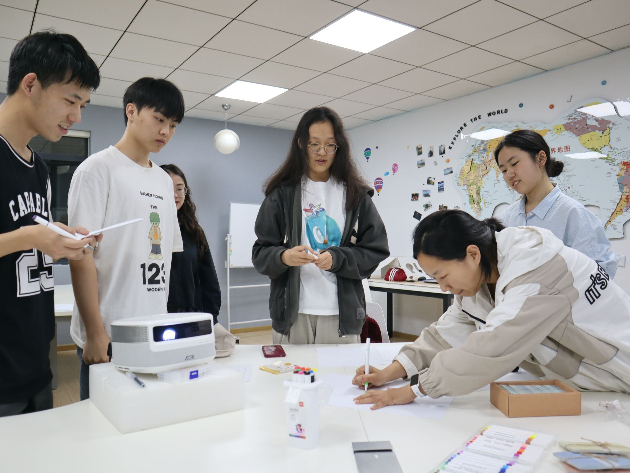 活动以轻松有趣的改编版“UNO”游戏拉开序幕,同学们在轻松愉快的互动中快速熟悉彼此。在随后的“团队共创”环节,各小组需共同设计小组名和LOGO,其中“向阳而生”组别出心裁地以组员手指共同组成花朵图案作为LOGO,组员袁薇还添加了彩虹元素。她解释道:“阳光穿过雨滴形成彩虹,每道色彩都象征着突破自我的可能和柳暗花明的希望。”